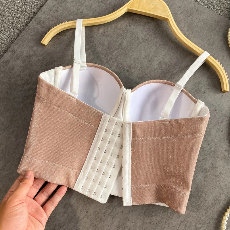 El Crop Top Gemma es la prenda perfecta para destacar en cualquier ocasión especial. Confeccionado en tela brillante con efecto glitter, aporta un toque sofisticado y glamuroso que realza cualquier outfit. Su diseño tipo corset estiliza la figura y aporta soporte en la zona del busto.