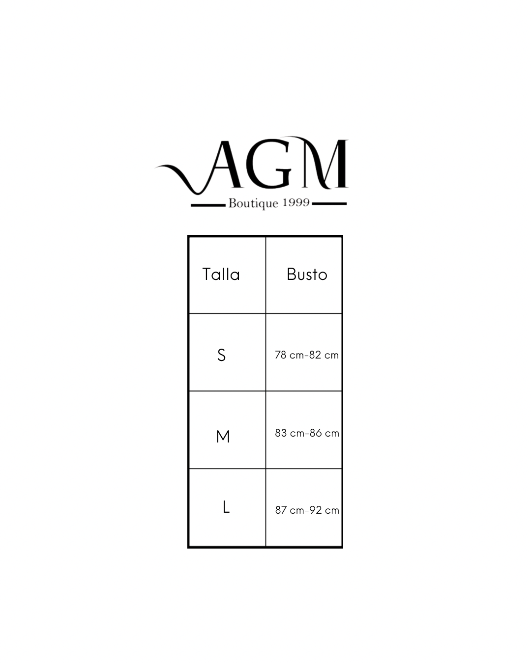 Adjuntamos la tabla de tallas, no olvides medirte contorneando el busto. Puede variar las medidas depende del producto.